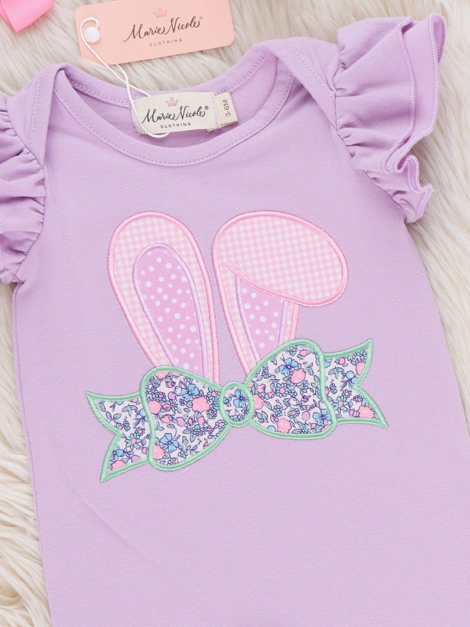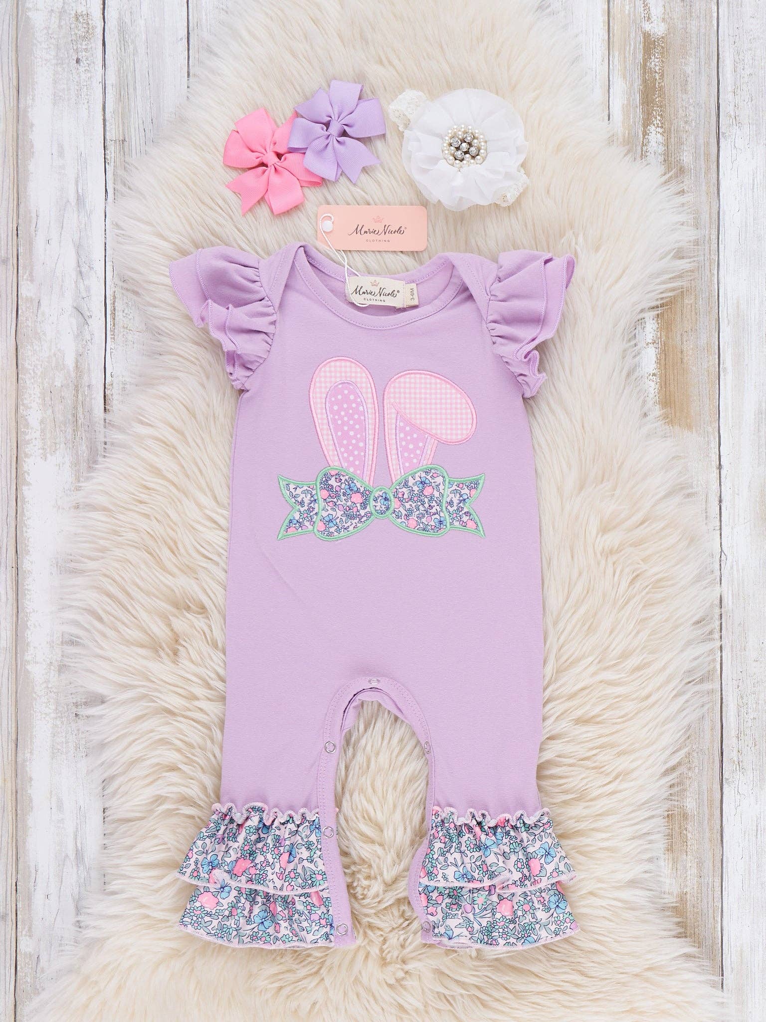 The Floral Bunny Ears Embroidered Ruffle Romper by Marie Nicole Clothing hops into Easter fun with sweet bunny-ear appliqué, flutter sleeves, and layered floral ruffles at the ankles for extra bounce. From Marie Nicole, the soft knit fabric and snap closure make changes easy, keeping little ones comfy for egg hunts, parties, and picture-ready spring adventures. * Snap buttons. * Fits true to size. * 97% Cotton / 3% Spandex * Trim: 95% Polyester / 5% Spandex*