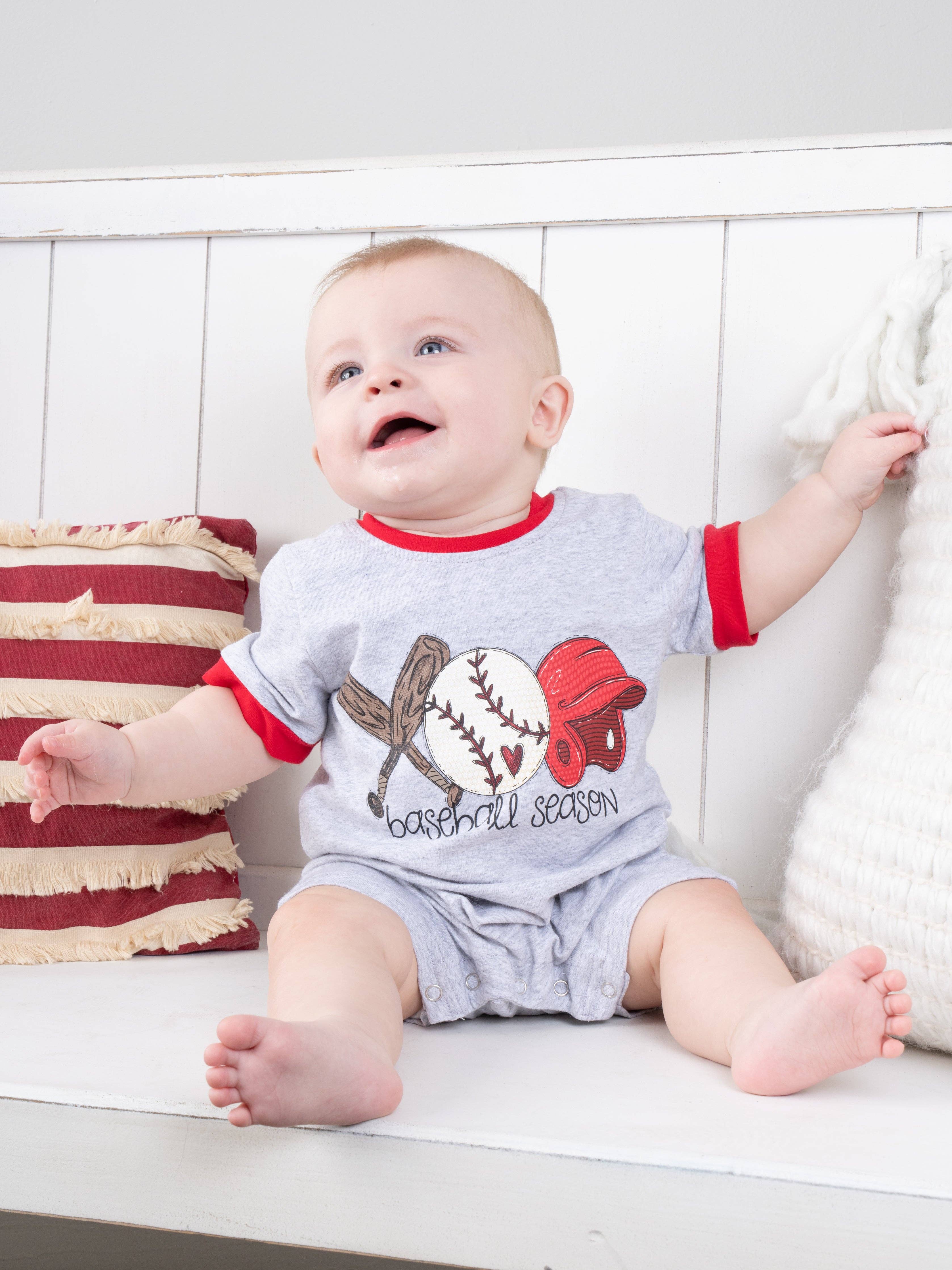 This sporty baseball family set by Marie Nicole Clothing is a game-winner! This grey romper features sweet baseball details & red ringer trim. * Snap buttons. * Fits true to size. * 97% Cotton / 3% spandex * Import. * Vinyl printed design "baseball season". *