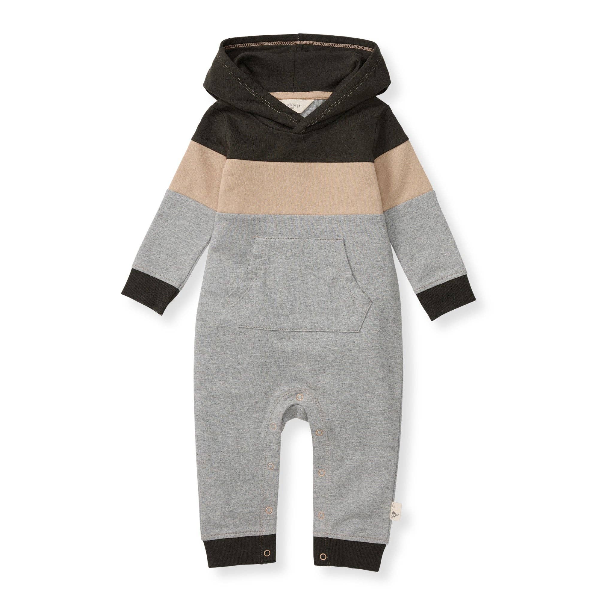 Your little bee will be the coolest kid around with this color blocked jumpsuit! * Color blocked hooded long sleeve jumpsuit * Super soft cotton * Hooded colorblocked jumpsuit * Kangaroo pocket * Ribbed cuffs at arms and legs * 100% Organic Cotton *