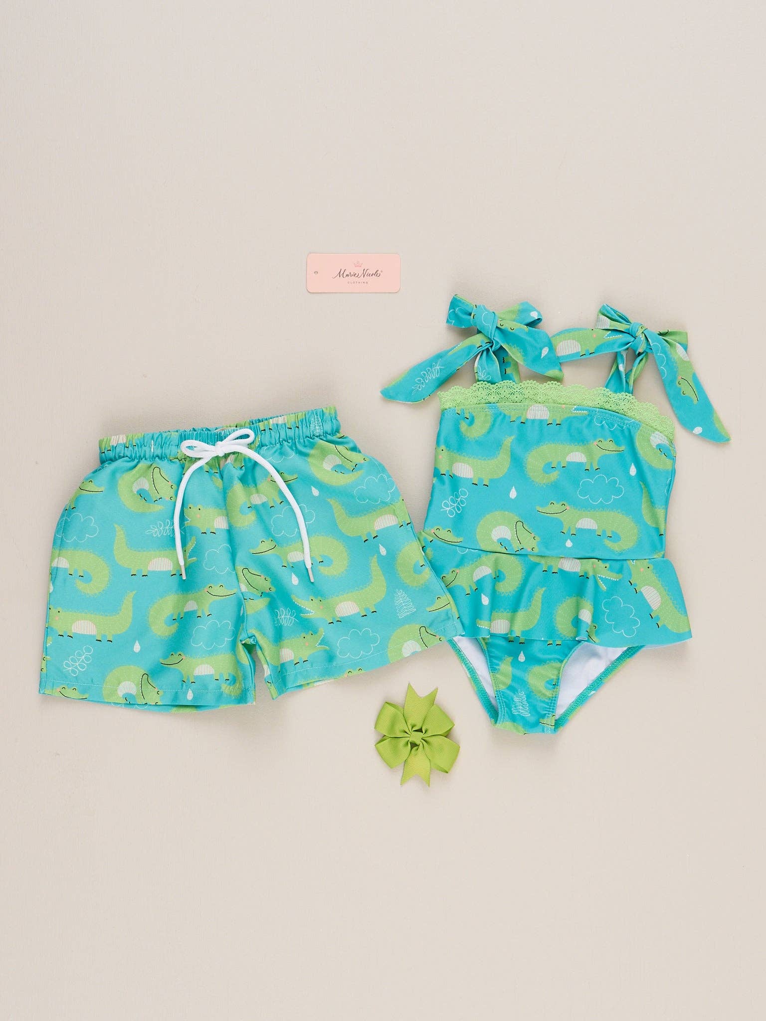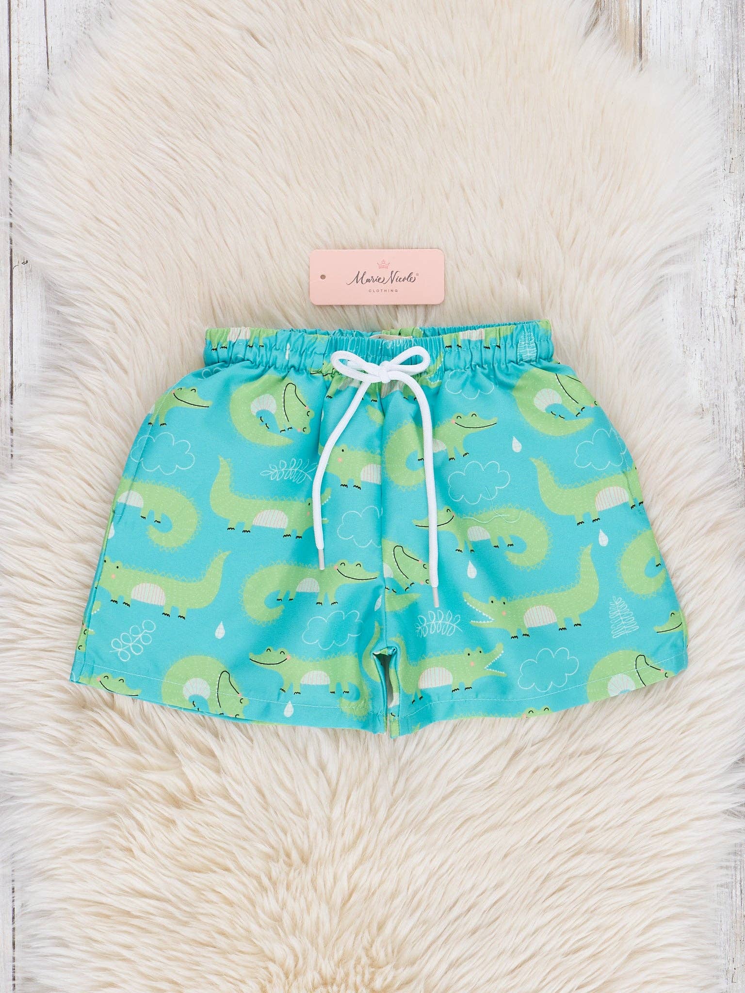 Make a splash with the Later Gator Swim Trunks. Featuring a playful alligator print and elastic waistband, these swim trunks will have your little one looking stylish while they splash around. With adjustable drawstring for a perfect fit and a matching sibling set available, it's perfect for fun in the sun. From Marie Nicole Clothing. * Fits true to size. * 82% Polyester / 18% Spandex *
