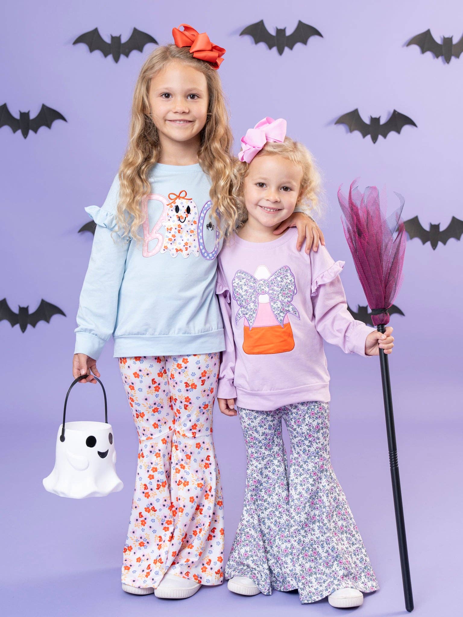 The Lil’ Miss Boo Embroidered Ruffle Bell Bottom Outfit is full of autumn delight and spooky Halloween charm. This stylish outfit from Marie Nicole Clothing features bell bottom pants for a retro finish. It charms with colorful flowers, ruffled shoulders, and brightly embroidered letters, decorated with ghost and bat designs. Crafted from soft, stretchy fabric, this two-piece set is comfortable for any occasion, making it the perfect choice for trick-or-treating, fall photos, and October gatherings. * Fits true to size. * Top: 97% Cotton / 3% Spandex * Bottoms: 95% Polyester / 5% Spandex * Accessories sold separately. *