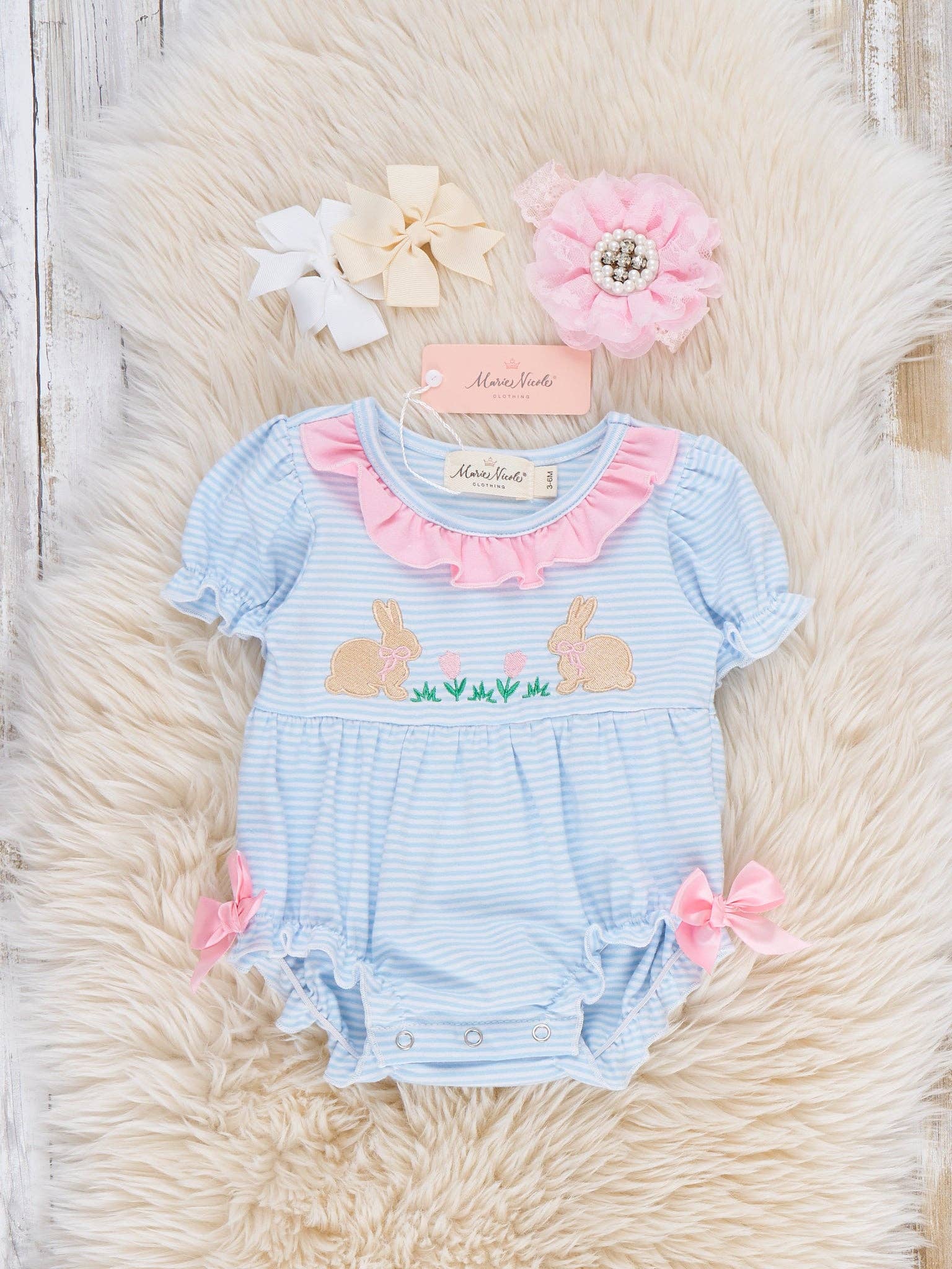 Picnic Hop Embroidered Cotton Ruffle Bubble by Marie Nicole Clothing. This baby girl’s bubble features stripes, an embroidered pair of bunnies with floral accents, a ruffled collar, puff sleeves, and bows on the hips, creating a playful, springtime look perfect for Easter or picnics. * Snap buttons. * Fits true to size. * 97% Cotton / 3% Spandex *