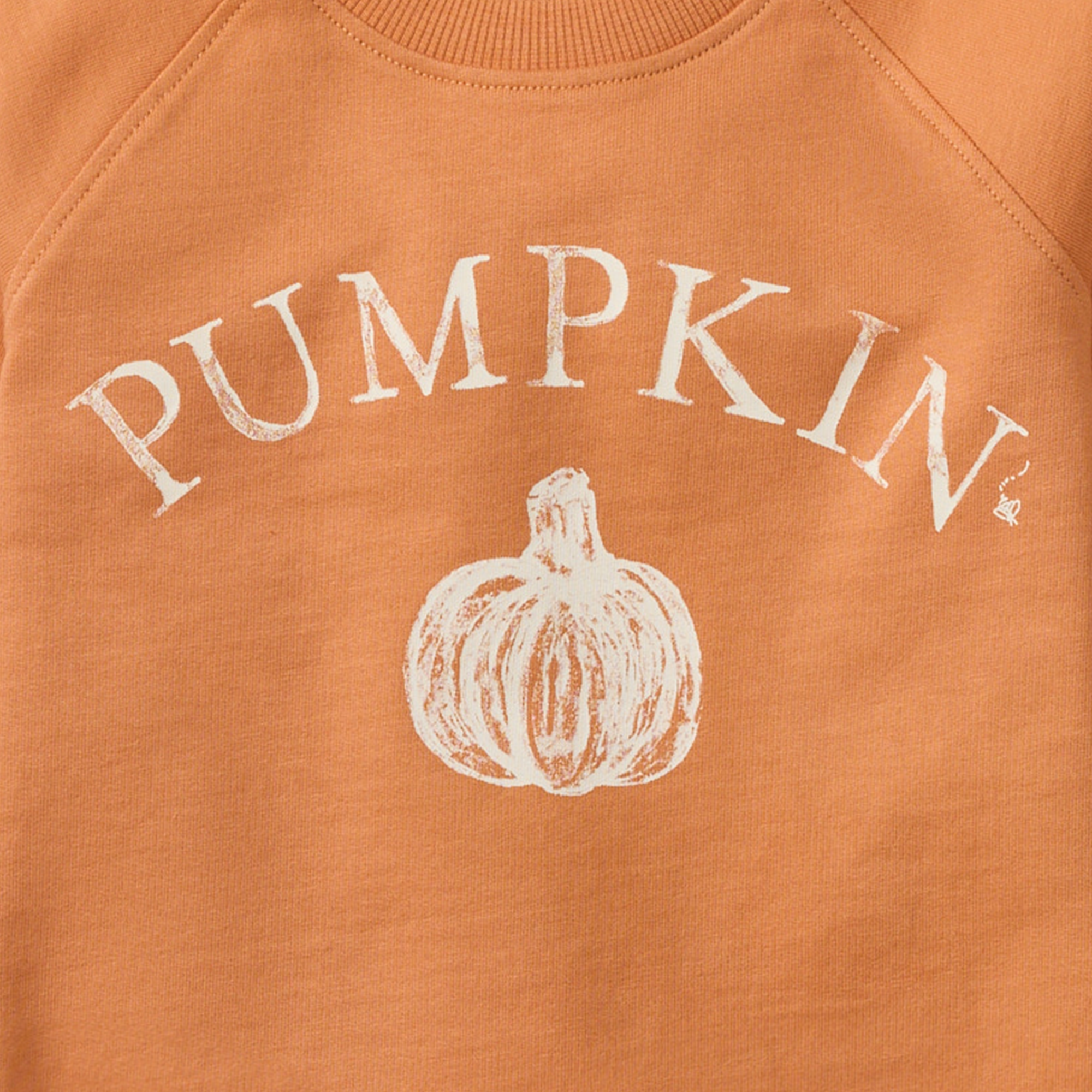 Your little pumpkin will be feeling festive in this sweet sweatshirt! * Oversized crew neck sweatshirt * 100% Organic Cotton * French terry * Cool distressed graphic * Raglan sleeves and curved bottom *