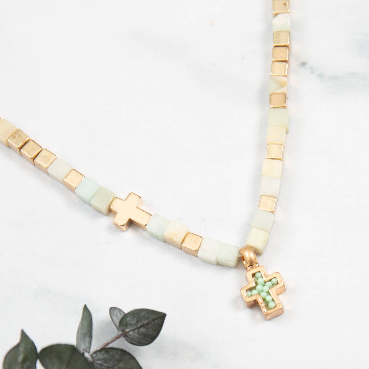 Religious Charm Cross Necklace - Natural Stone Cubic Bead: Grey Jasper