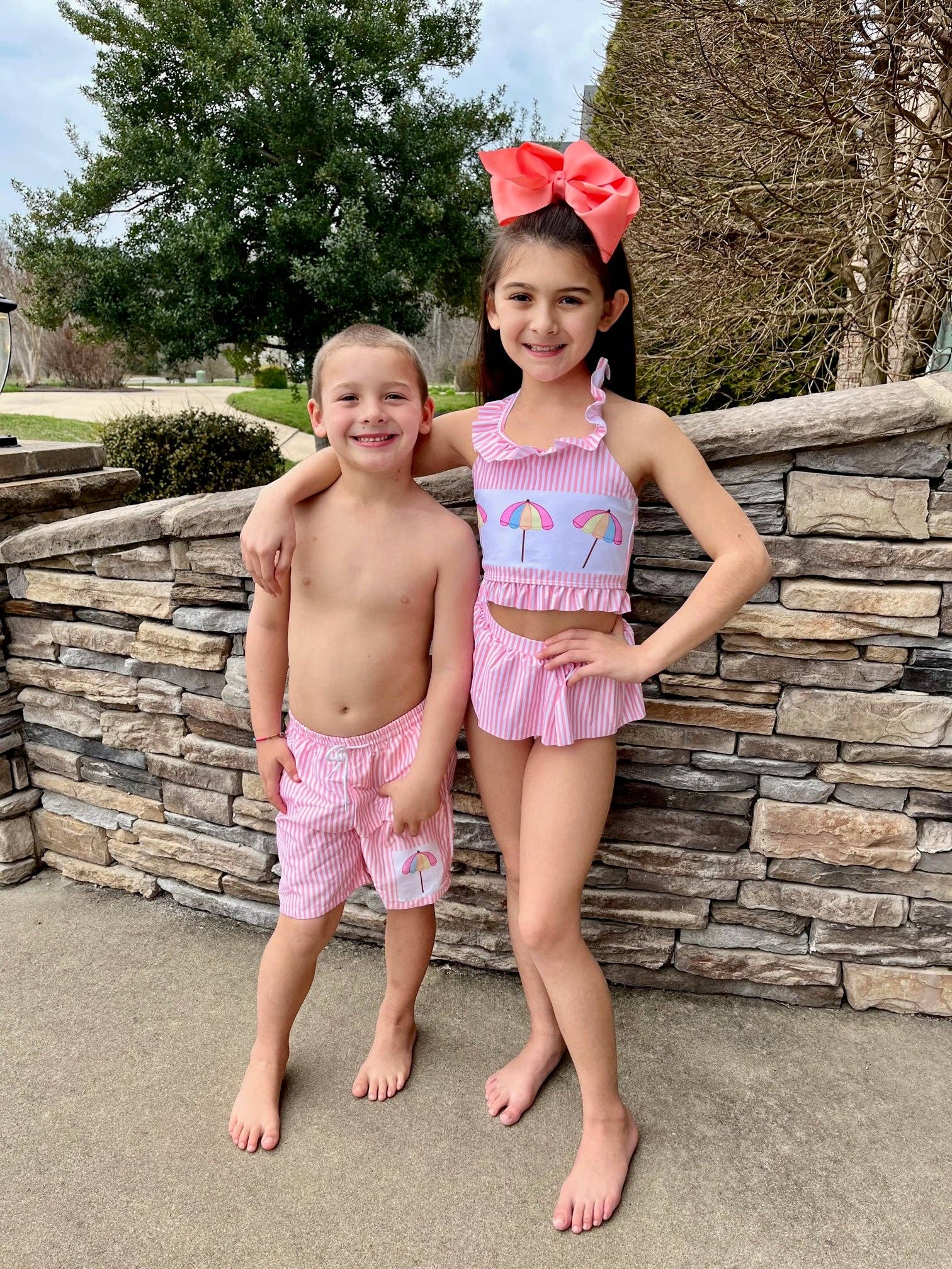 Our Striped Umbrella Sibling Set by Marie Nicole Clothing brings sunshine to your whole family! This suit features a playful umbrella detail, striped pattern, and adorable ruffles; you won't have any problem keeping your kiddos safe while they're splashing around! Now that's a load off! Addison is 71 lbs & 54 inches tall wearing a 4XL. * Fits true to size. * Fully lined. * Tie straps. * 82% Polyester / 18% Spandex *