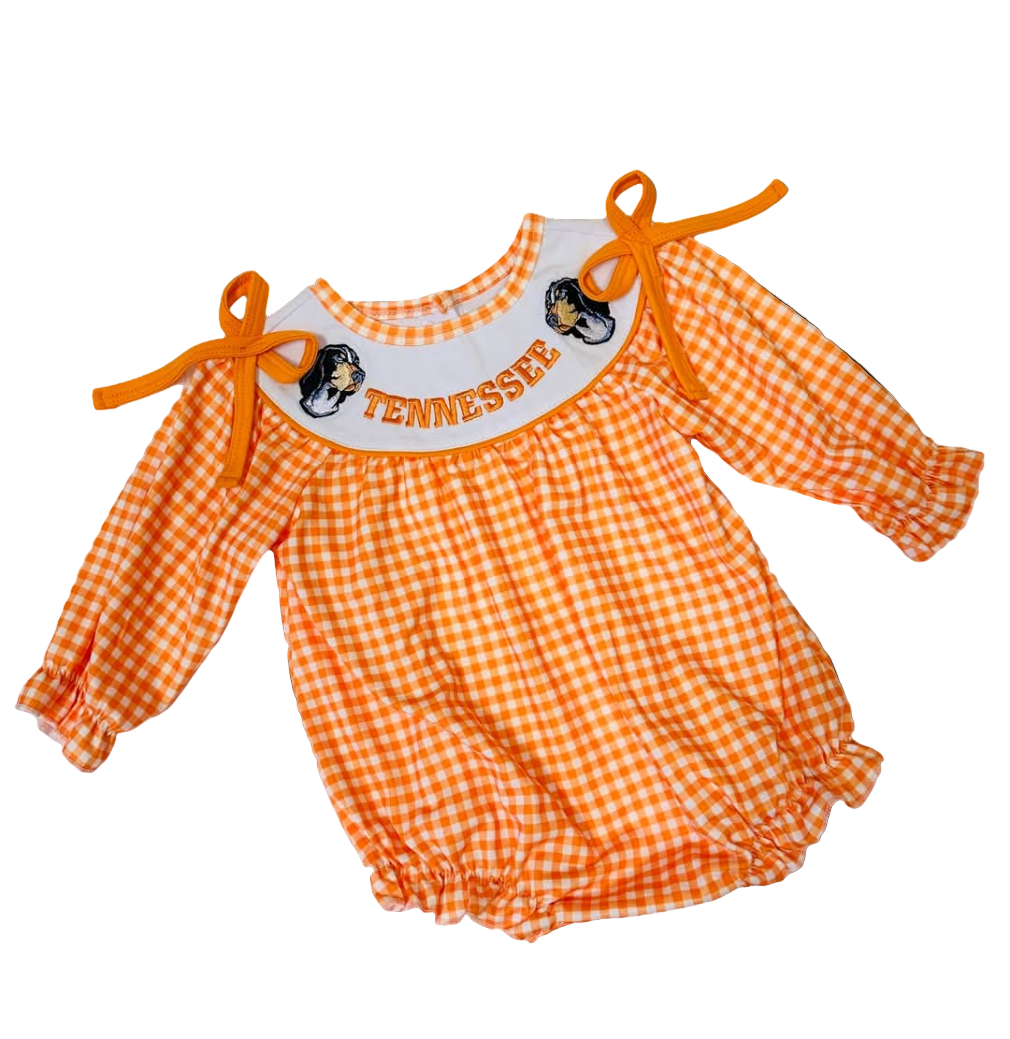Cute girls Tennessee Romper for the Tennessee loving Momma's Cute Long Sleeve orange checked bubble romper.